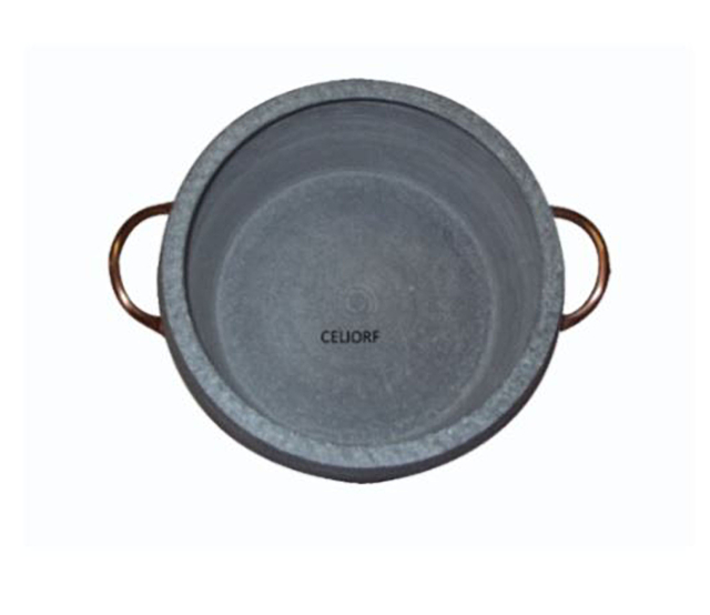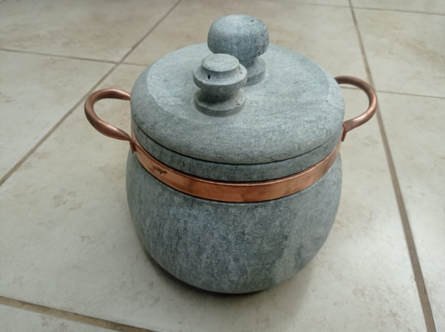 * O próprio peso da tampa segura a pressão e retém o calor, o escape da pressão se dá por uma válvula também feita em pedra sabão.